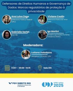 Painel no Congresso Internacional de Proteção de Dados (CPDP-LATAM) realizado em junho de 2025 na FGV-RJ com participação de Ana Luisa Zago de Moraes, Viviane Ceolin Dallasta Del Grossi (D.P. do Timor Leste/DPU), Igo Martini (PPDDH/MDHC), Gabrielle Sales Sarlet (PUCRS) e Lutiana Valadares Fernandes Barbosa (CIDH/UFMG/DPU). Disponível em: